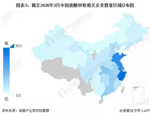 通過企查貓網(wǎng)站對廢酸回收業(yè)務相關企業(yè)進行篩選統(tǒng)計分析,截至2020年3月,中國廢酸回收相關企業(yè)數(shù)量為177家,其中,浙江、山東、江蘇三省廢酸回收企業(yè)數(shù)量排名前三,分別為30家,24家和23家。