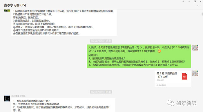 居家辦公期間不能忽視專業(yè)知識(shí)的學(xué)習(xí)。基于微信平臺(tái)建立學(xué)習(xí)群,由專人負(fù)責(zé)網(wǎng)上分享鍍鋅專業(yè)知識(shí),并進(jìn)行網(wǎng)上問答互動(dòng)。