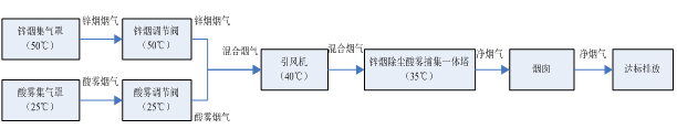 依托鋅煙收集罩、酸霧封閉間收集鋅煙酸霧,通過風管利用風機將鋅煙、酸霧抽送到無障礙通透凈化過濾塔;然后利用電捕技術在電捕室內進行鋅煙、酸霧捕捉,通過電捕室內極板裝置進行捕集吸附;***采用高壓水簾進行沖洗脫附,使鋅煙、酸霧資源回收;尾氣通過排氣管道實現超微排放。