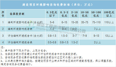 Сбор за консультацию по вопросам воздействия на окружающую среду может основываться на « Стандарте платы за оценку воздействия на окружающую среду строительных проектов» (оценочная цена [2002] 125), в котором расчетная сумма инвестиций используется в качестве основы для расчета платы, и в соответствии с различными характерами и содержанием строительных проектов взимается фиксированная сумма, основанная на расчетной сумме инвестиций.
