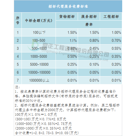 Плата за услуги тендерного агентства может быть получена путем прогрессивного исчисления разницы по фиксированной ставке со ссылкой на « Уведомление Государственной комиссии по планированию развития о публикации « Временных мер по управлению сборами за услуги тендерного агента» (Номер [2002] 1980).