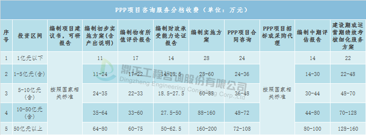 Основные консультативные услуги по проекту PPP включают: проектное предложение, технико - экономическое обоснование, предварительный план реализации, отчет об оценке рентабельности, отчет о демонстрации финансовой доступности, план реализации, консультирование по контракту на проект PPP, агентство по закупкам тендеров по проекту, среднесрочную оценку, оценку эффективности в период строительства или эксплуатации, уточненную программу обслуживания, рекомендуется взимать плату со ссылкой на размер инвестиций в проект, как указано ниже: