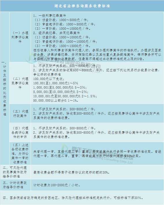 Плата за юридические консультационные услуги может быть получена со ссылкой на местные тарифы, такие как местные стандарты провинции Хубэй - « Уведомление Управления цен провинции Хубэй и Управления юстиции провинции Хубэй о выпуске « Меры по внедрению системы взимания платы за юридические услуги в провинции Хубэй (временные) » (номер 258, 2006), в частности: